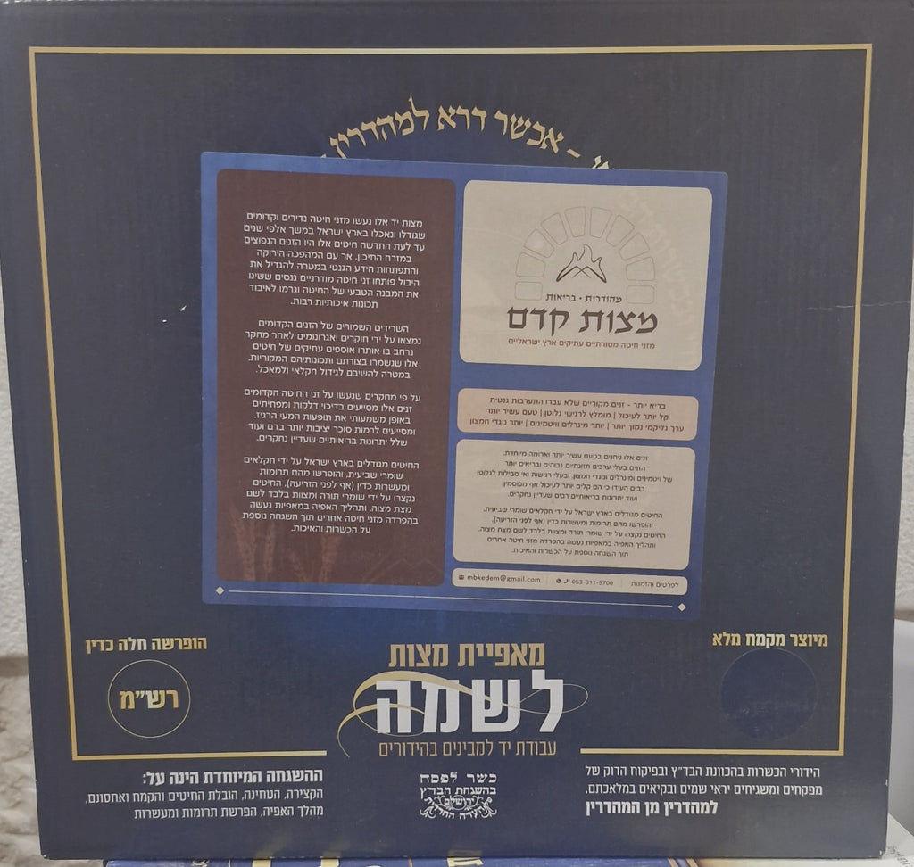 Crafted by Matzot Kedem Chabura, produced with a focus on quality and traditional techniques, these matzot are baked under B'datz Eida HaCharedis Supervision. These matzot uphold the highest standards of quality and kashrut, offering an Ancient Grain option well-suited for the Seder.