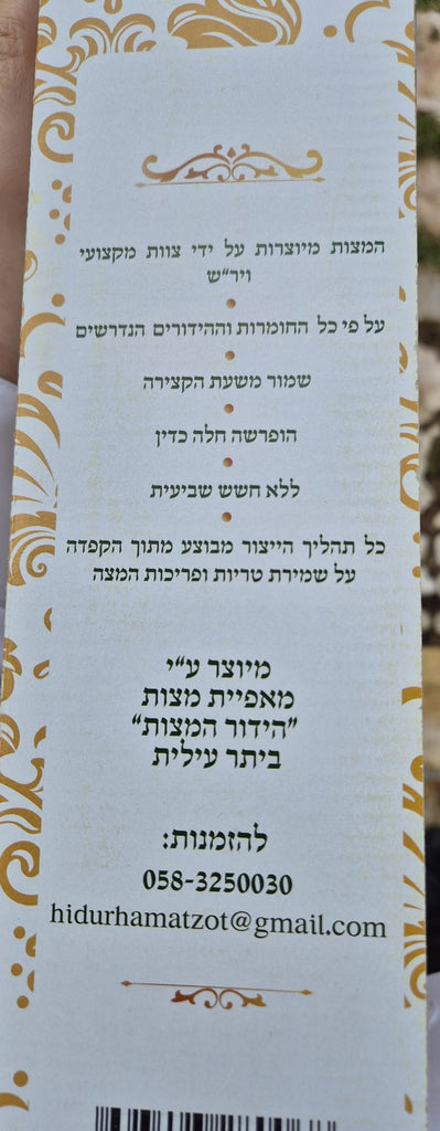 Confectionnées par Matzot Kedem Chabura et produites à la boulangerie Boyan Matza de Beitar Illit, ces matzot sont réalisées dans le respect des techniques traditionnelles et sous la supervision de B'Datz Eida HaCharedit Yerushalyim. Elles répondent aux plus hautes exigences de qualité et de cacherout, et constituent une option à base de céréales anciennes idéale pour le Seder.