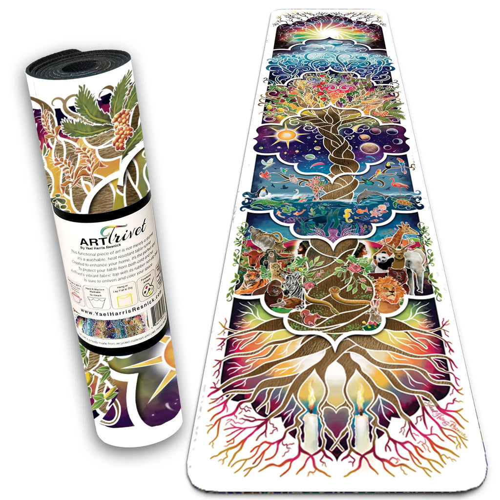 ראנר שולחן יפהפה, עם פאנלים המציגים את שבעת ימי הבריאה. מידות 30x120 ס"מ. מעולה להגשה חמה של מנות. חלק עליון מבד עם גומי תַחתִיתתואם את כיסוי חלה בראשית.