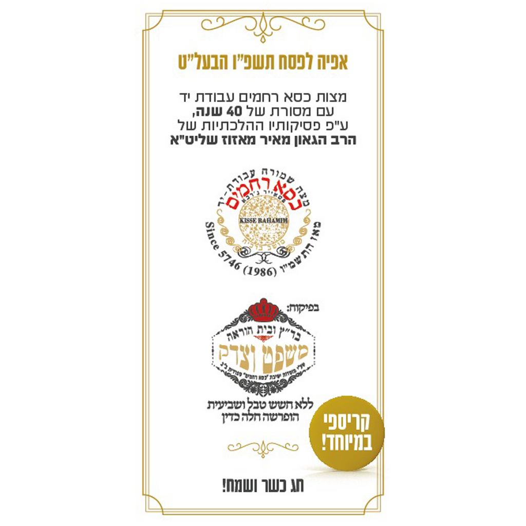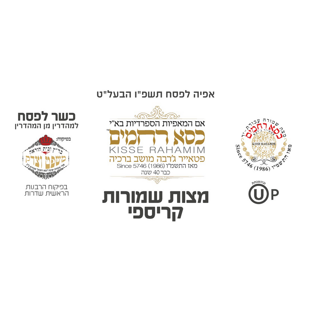 The Kisei Rachamim Hand Extra CRISPY Whole Wheat are twice-baked for a unique, extra crispy texture. These matzot are made by Kisei Rachamim, under the supervision of Rav Mazuz shlit’a and certified kosher by the OU. After the initial baking, they are left to dry for approximately 3 weeks before being baked again to achieve their signature crispiness. Kisei Rachamim, a trusted name since 1986, continues to uphold the highest standards of kashrut and craftsmanship.